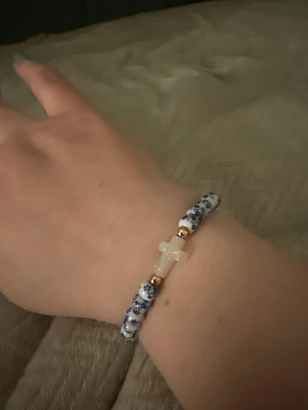 Discover the timeless beauty of our porcelain floral collection, where tradition meets contemporary style. Crafted with 6mm porcelain beads adorned with a delicate blue floral pattern, this bracelet showcases our signature cross infused with authentic holy water sourced directly from Lourdes, France.