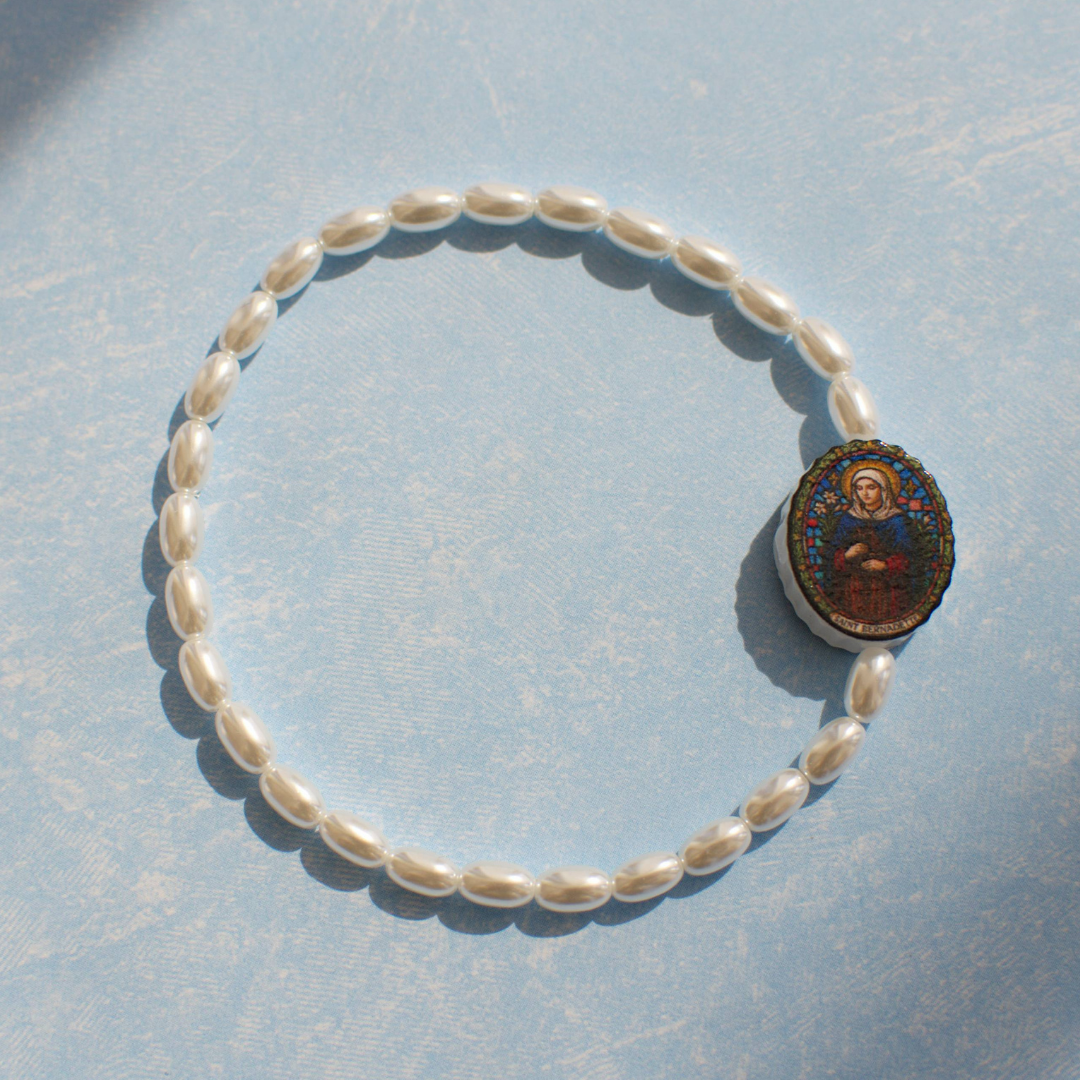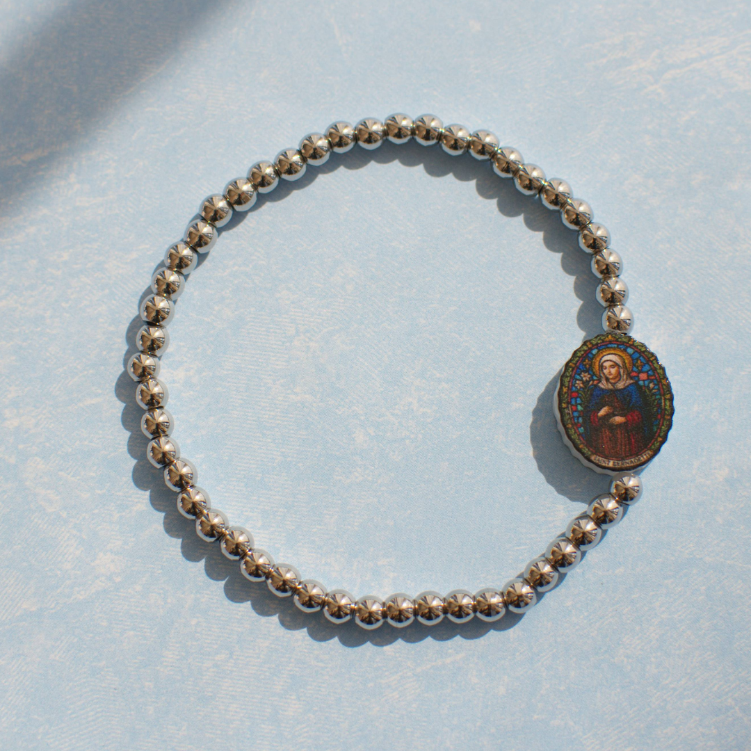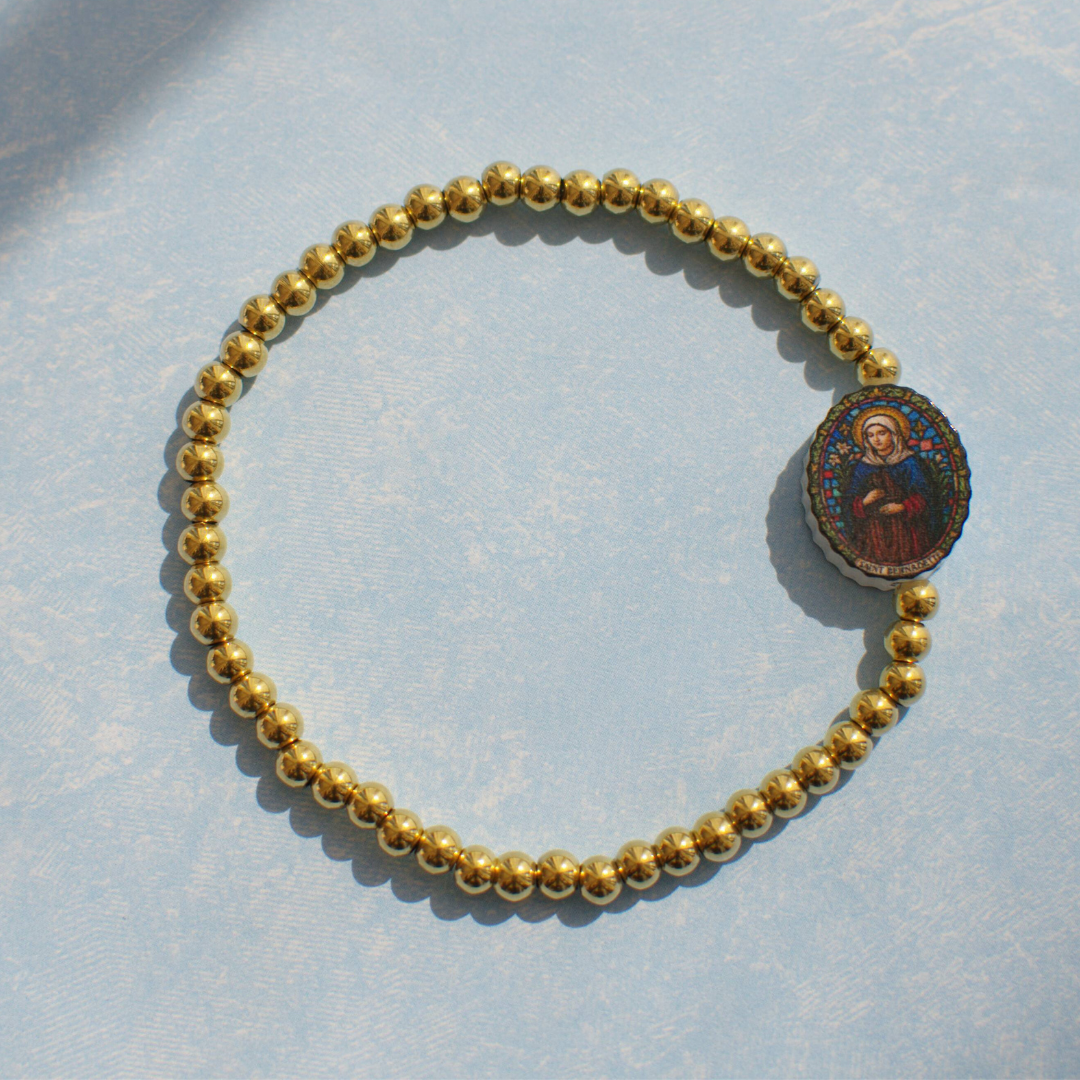 This bracelet is a beautiful reminder that miracles begin with belief. Known for her visions at Lourdes, Saint Bernadette represents hope, healing, and quiet strength. Each medal is infused with authentic holy water sourced directly from Lourdes, France.