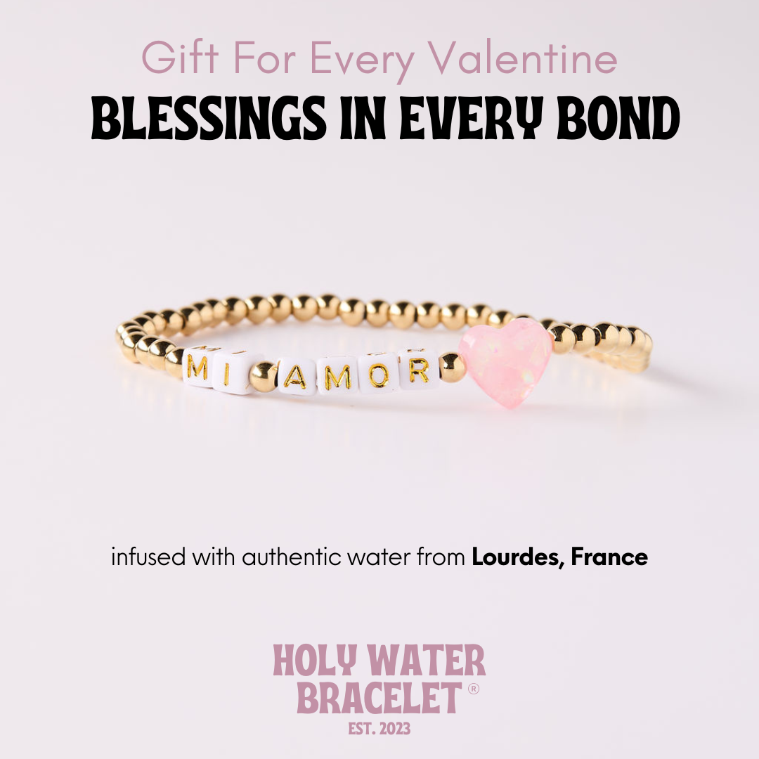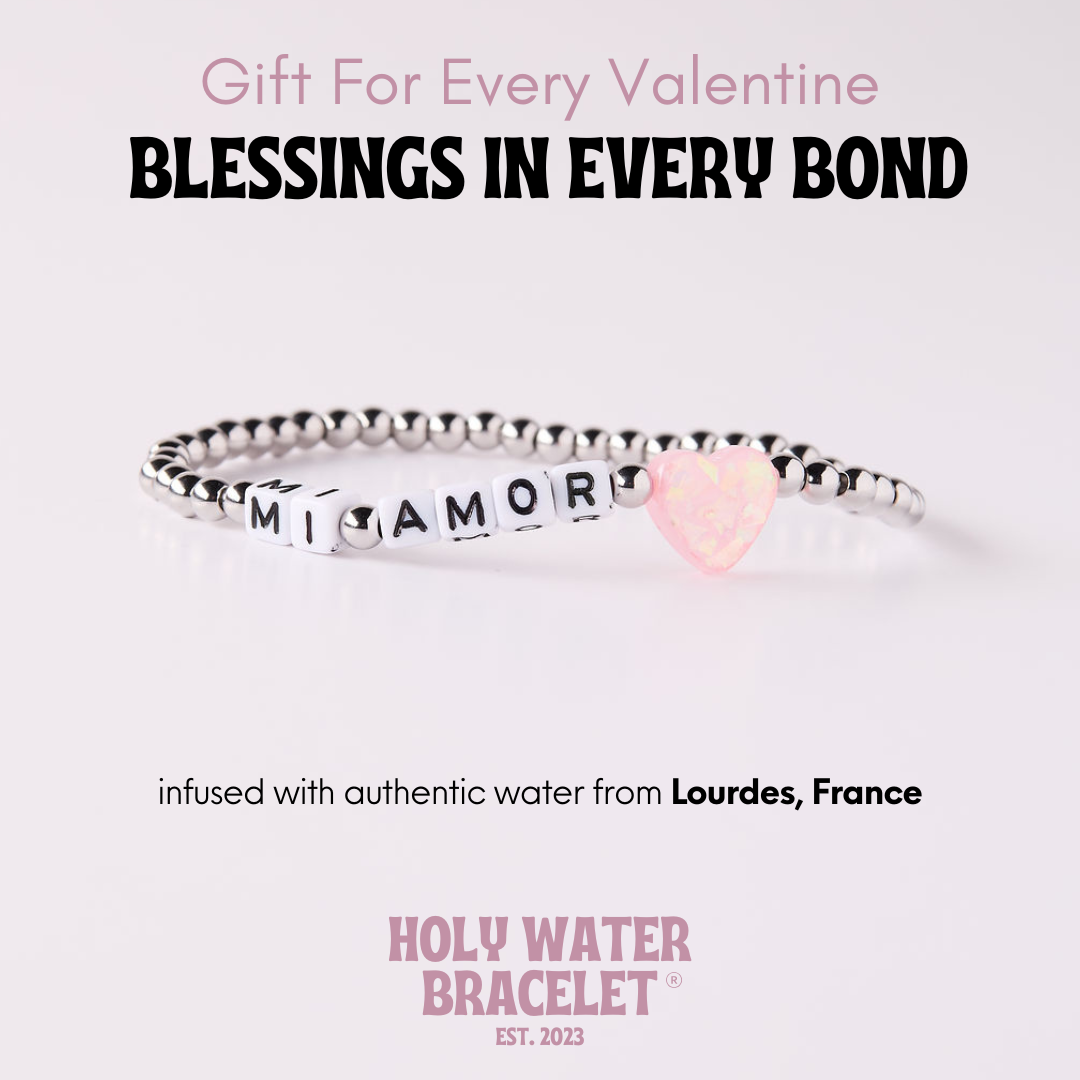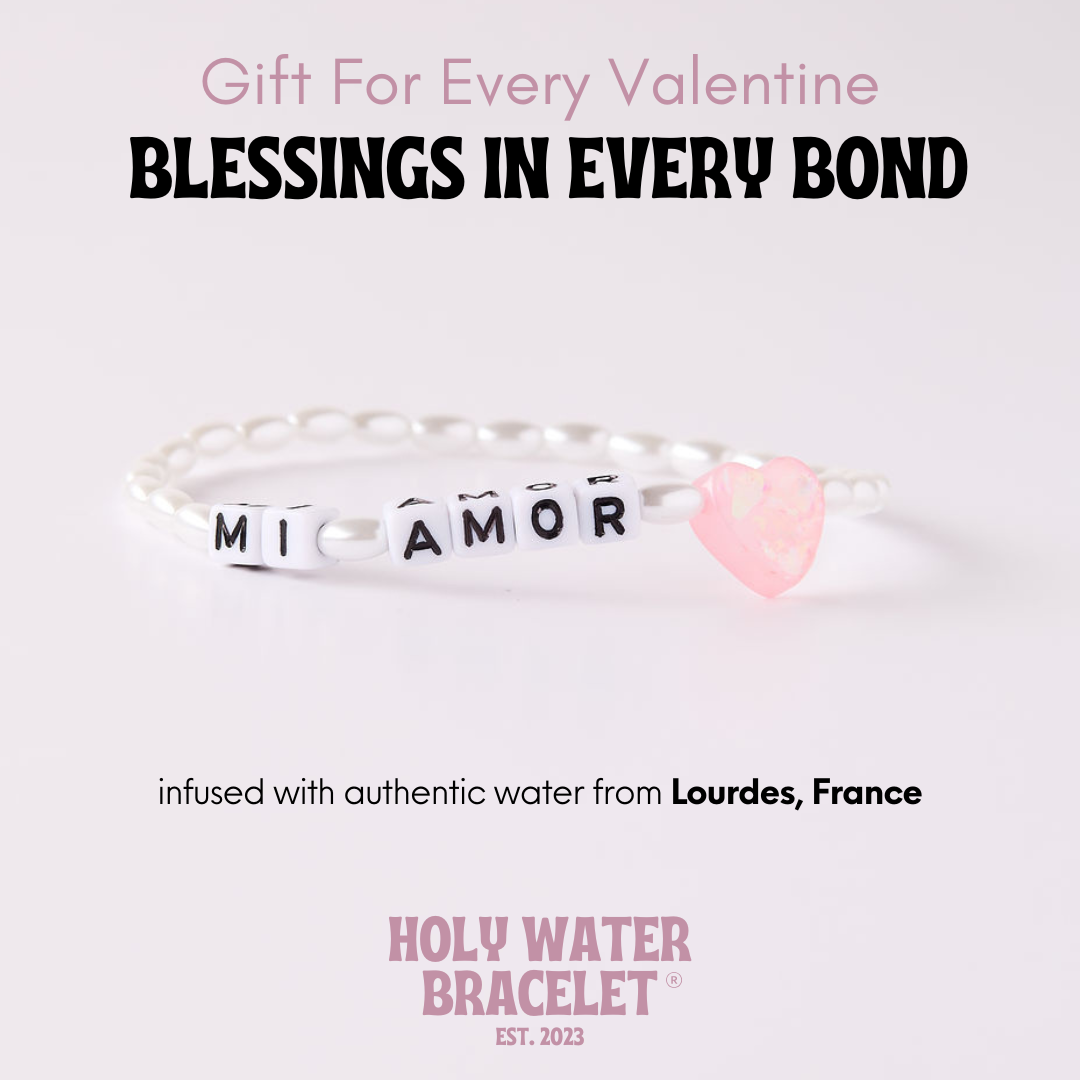 "Mi Amor" says it all - your love, your connection, and the promise to always cherish them! Featuring our classic pink heart, infused with authentic holy water sourced directly from Lourdes, France.