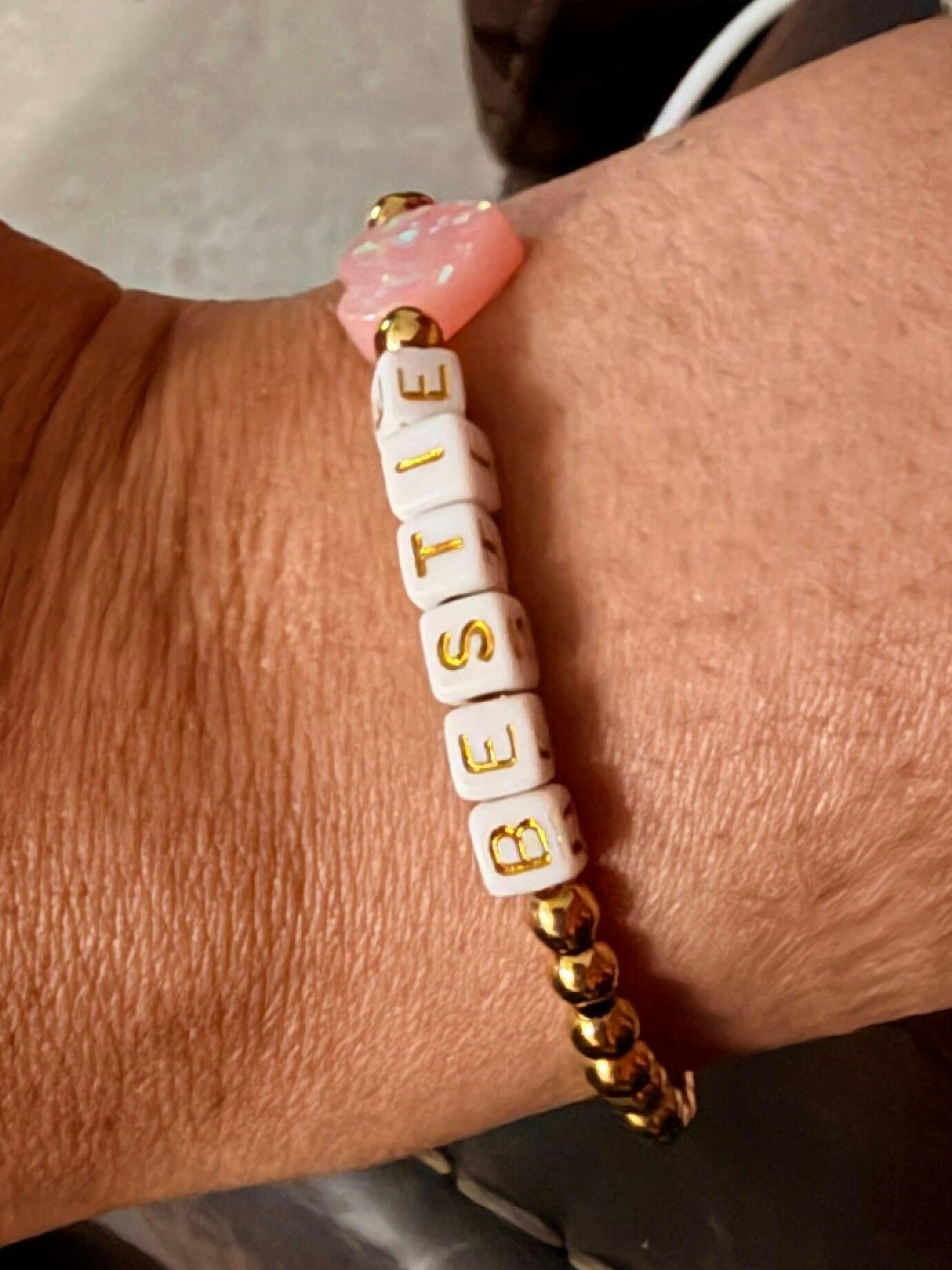 Your word. Your message. Our best-selling style is now available with the ability to customize with these super cute square letter beads. Each bracelet is handmade in our studio in Rhode Island and features our signature pink heart infused with authentic holy water sourced directly from Lourdes, France.